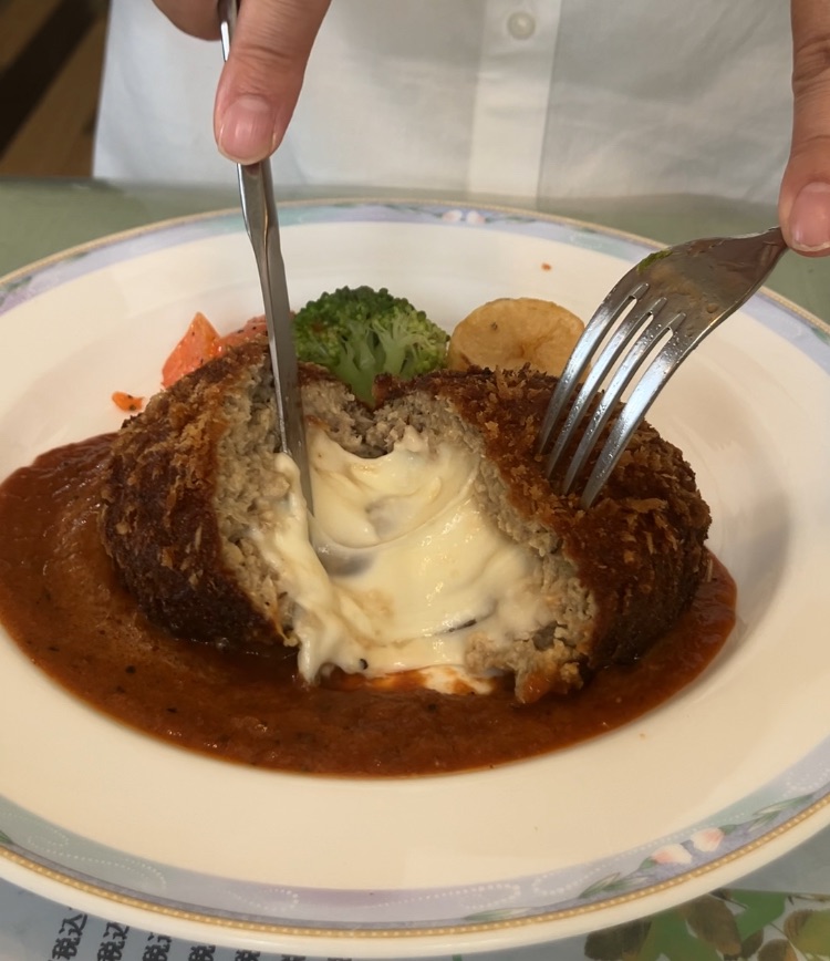 半分に割ると、中から肉汁とともにたっぷりのチーズが出てきました!