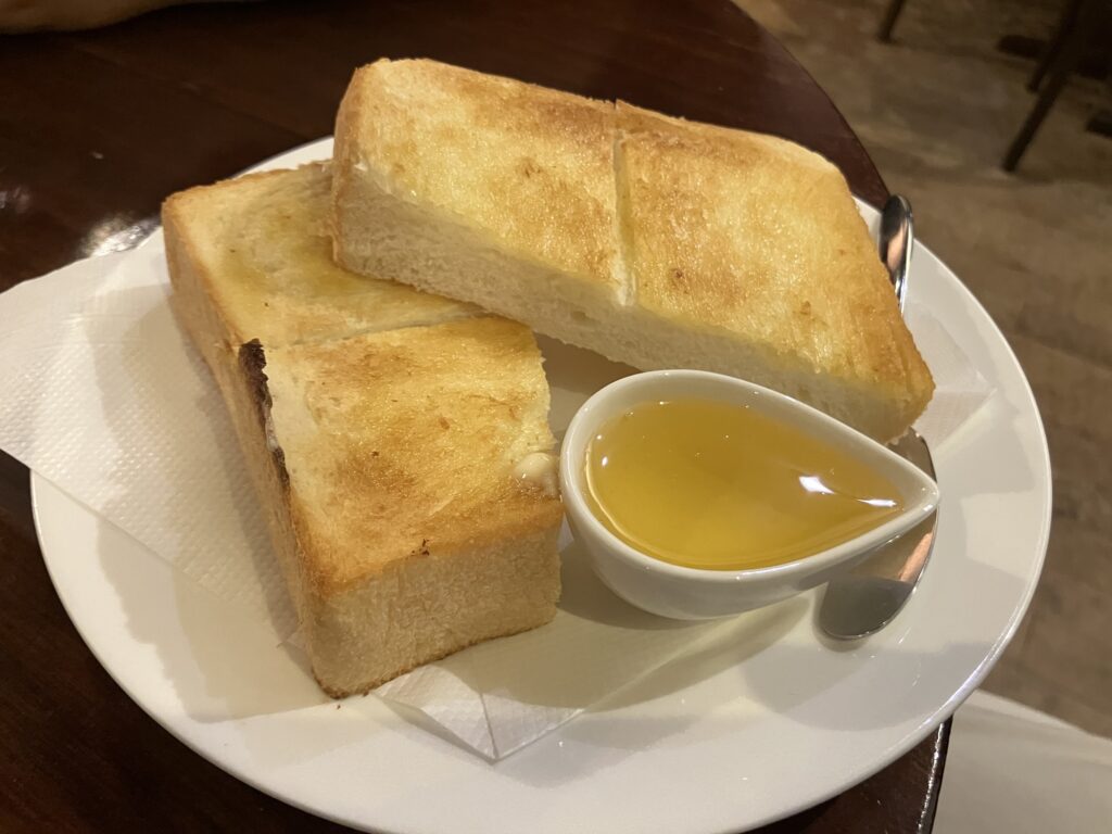 厚めのトーストにはバターが塗ってあるので、塩味とはちみつの甘味のバランスが良くて美味しいです。