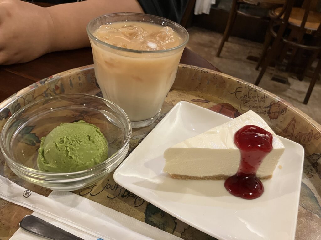 ケーキの他に抹茶アイスとドリンクがついてきます。